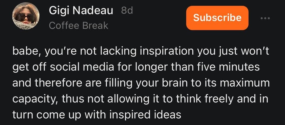 pointed out in the Note below, we need space for inspiration. Staying off social media and the internet in general as much as possible, and cultivating a life offline, leads to greater originality and creativity in your own life because you’re not filling your brain with other people’s thoughts 24/7.So far in this series I haven’t really mentioned anything about how digital minimalism relates to neurodivergence. Truth be told I am still unravelling this in my brain as I think it’s a much more nuanced and complex topic than it is sometimes painted as. I’m assuming most people reading this are subscribed to me for my neurodivergent content, so I’m careful to try to link in relatability to neurodivergence — but until I unravel more threads in my brain, the best I can offer you is that I’ve noticed a positive impact on my ADHD symptoms and traits the less time I spend online, specifically the less time I spend mindlessly scrolling or on social media.
