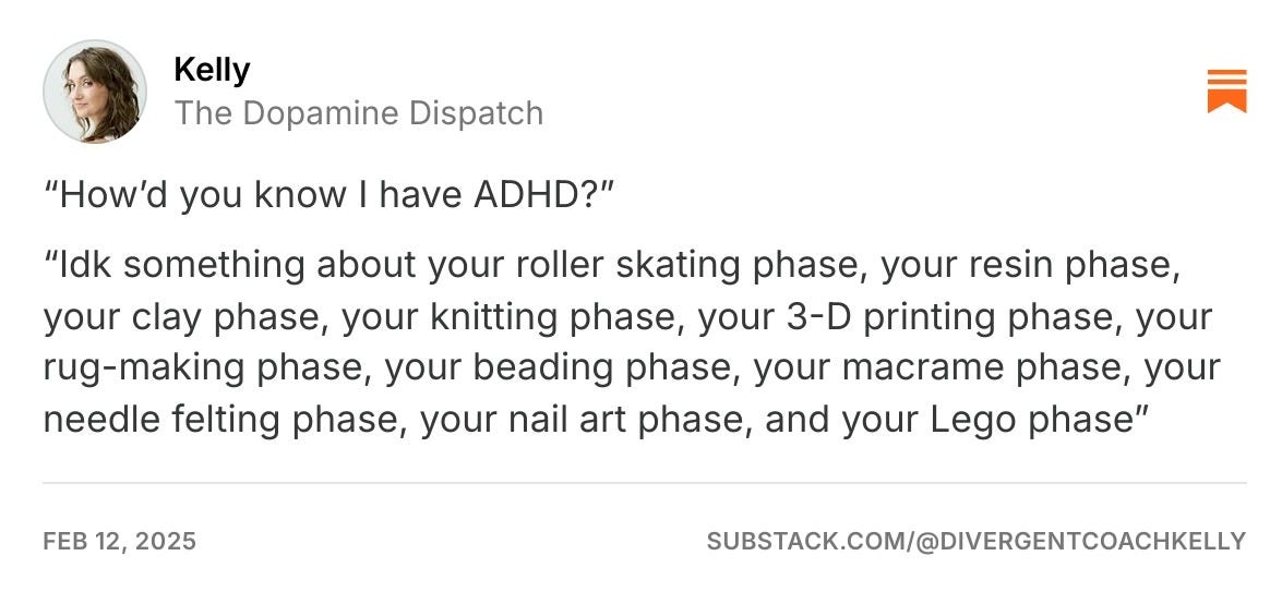 Fr those of us with ADHD, our phases are partly what makes us interesting—we’re curious human beings with multi-passionate hearts and brains that don't do well boxed in in traditional society. Let’s appreciate the phases we go through and the things that, though we may not stick to for life, nonetheless entertain, inform, and inspire us, even if momentarily or temporarily.